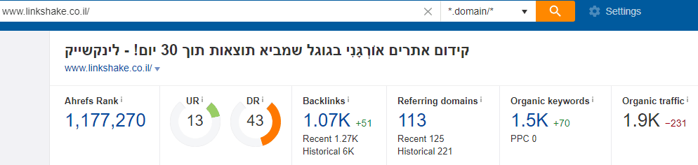 - AHREFS – הכלי המוביל והאיכותי ביותר כיום לניתוח קישורים. יש לו גם גרסה חינמית שתאפשר לכם לעשות כמה בדיקות ראשונות. כאן תוכלו לקרוא מדריך קצר איך קוראים את הנתונים ב- AHREFS